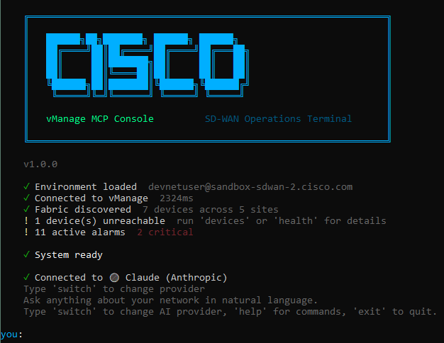 All three providers use the same tool definitions and the same system prompt. The AI sees structured JSON from the correlation engine and formats it for the terminal. It never fabricates data because the tools fetch from a live vManage instance.
